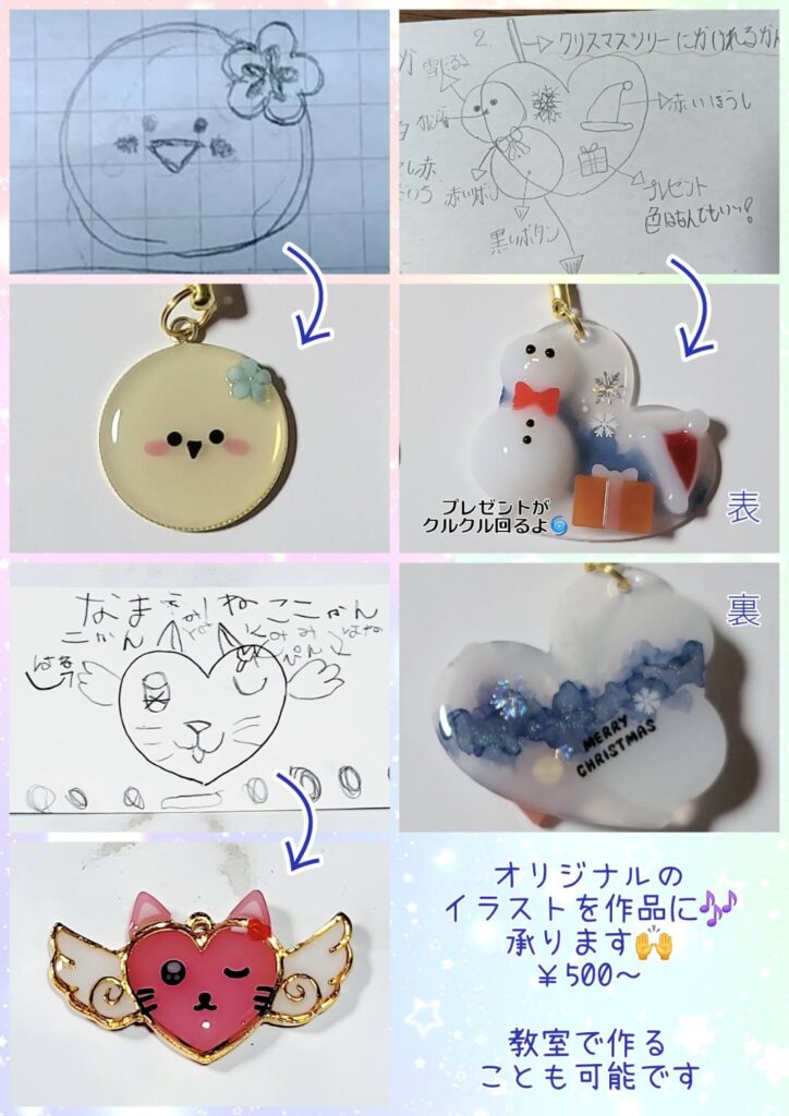 えむレジンDIY教室さんでは、完全オリジナルのチャームづくりもできます!