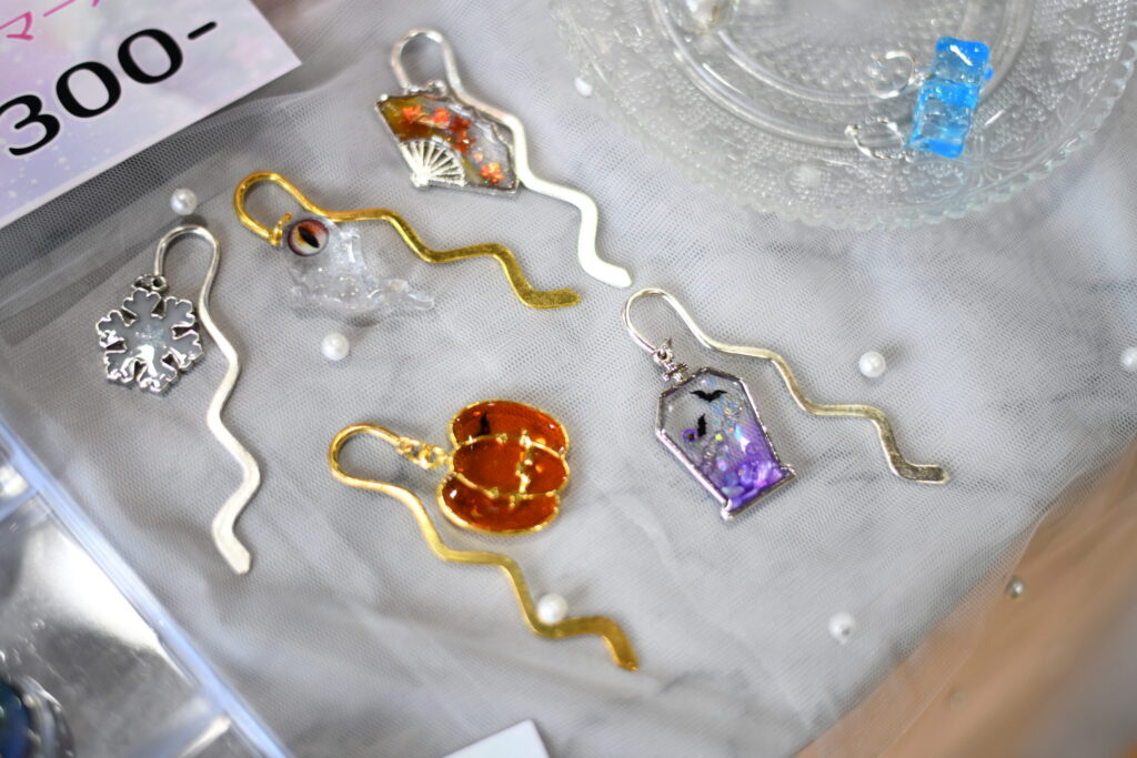 ショップに並んだ作品を拝見しながらお話していて、レジンといろんなパーツの組み合わせが無限にあり、楽しい作品になっているのだと感じました。